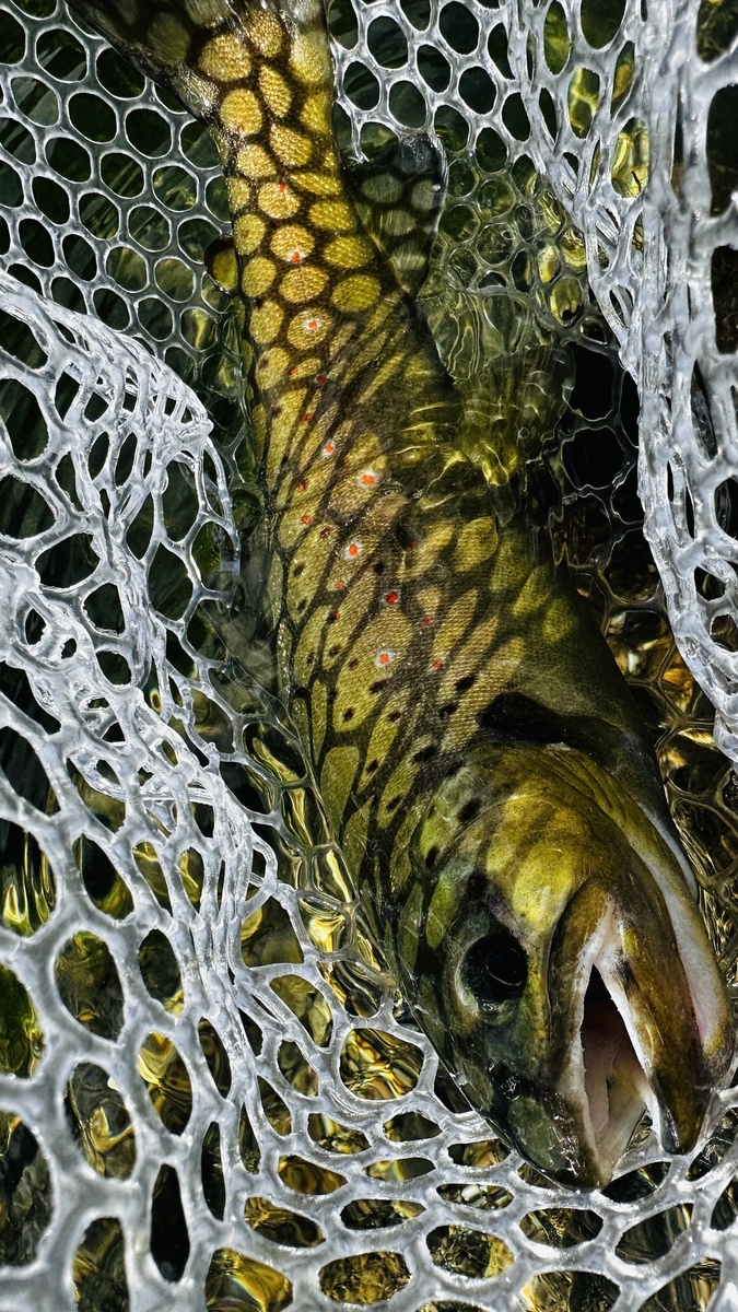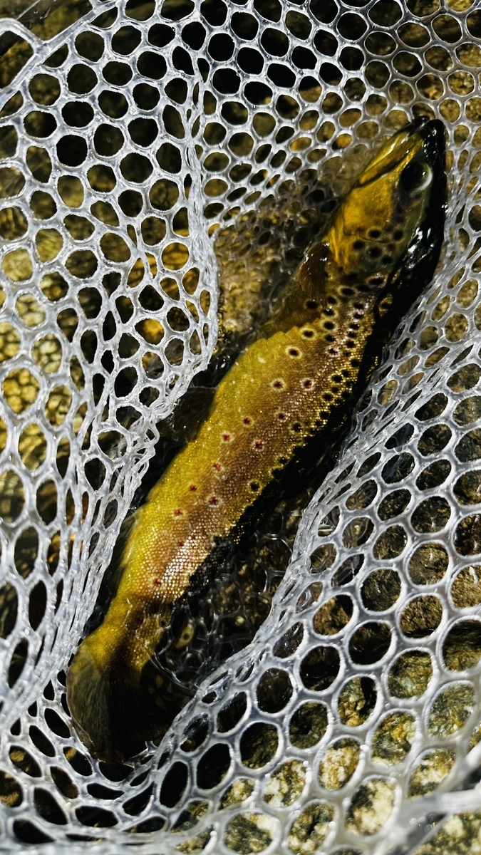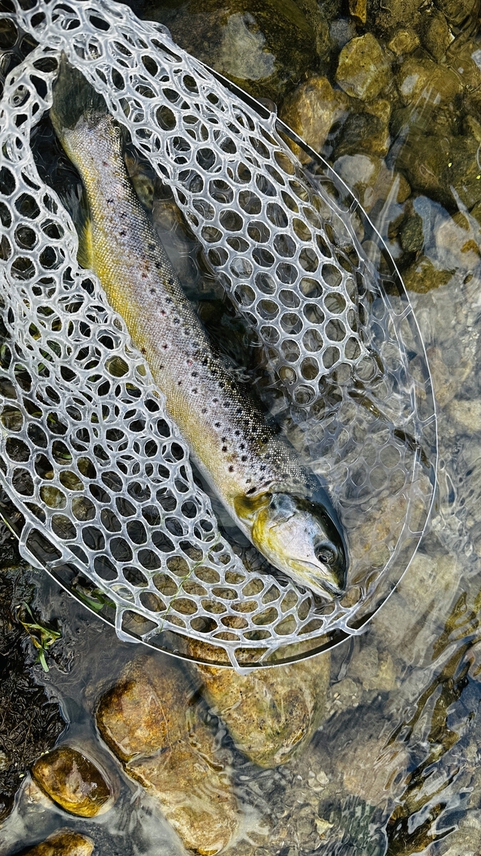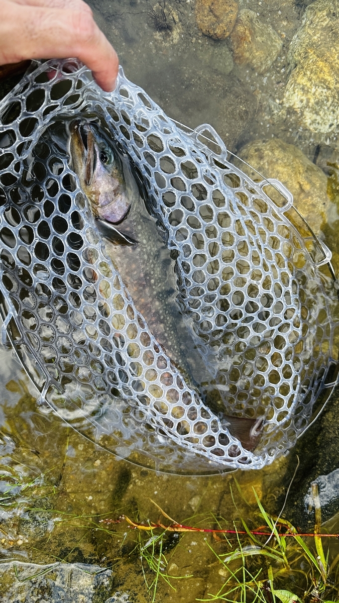 流れが結構速いのだけど、岩陰からイワナが出てきたりブラウンが追いかけ回したり。